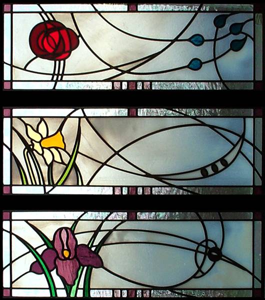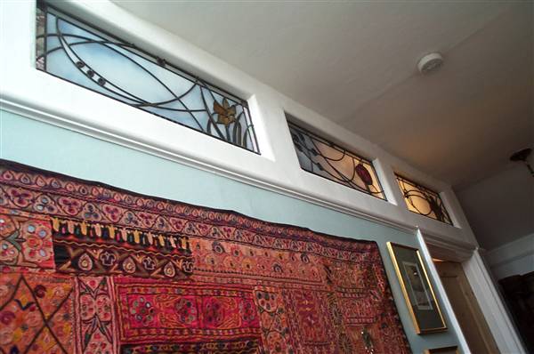 | These 3 panels stretch across 3 scenarios: an internally lit panel, a panel half lit and half behind wall and a panel fully behind wall. The glasses chosen had to work across all 3 scenarios and also as a set. Cloudy Kokomo was used for the main background glass. It has slight translucency so lets light through but also has enough obscurity to work well with a brick wall behind. Iridescent waterglass was used in the borders again this is see-through but also retains its iridescence when light is blocked from behind. Silvered coloured glass was used in the features where the brick wall was behind. Ref: mc03b | ||