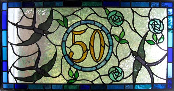 | This design was adapted from an original Art Nouveau panel from Barcelona. You can see another version at ac04. Different handmade blues were used in the borders to further enhance the arts and crafts look. Ref: ac01 | ||