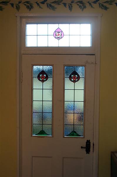 | A kitchen door set. The green square around the roses is old Muranese which, because of its heavy embossment, really sparkles when it catches the light. Ref: ac03 | ||
