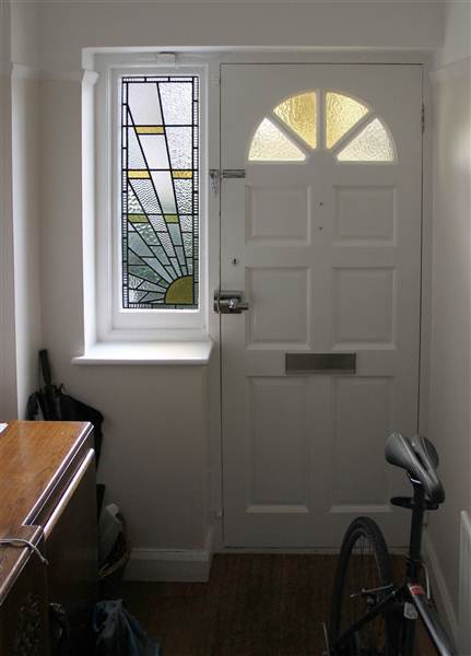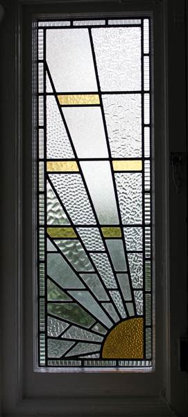 | This panel is a copy of an original Art Deco panel see re19 using original 1920's glasses mixed with some modern matches. The new front door has coloured segments which link to the yellow bands in the side panel. Ref: ad07a | ||