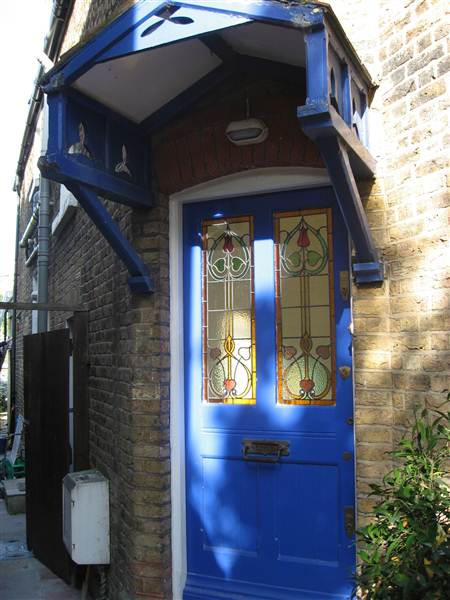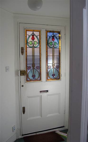 | This lovely Art Nouveau design was adapted from a pattern book, faceted jewels were added to create a sparkly decorative effect. The green leaves are Green Venetian style glass, from a batch made especially for us by the English Antique Glass Company. The door set is accompanied by a set of mezzanine and hallway panels, see an11c and an11f. Ref: an11a | ||
