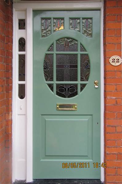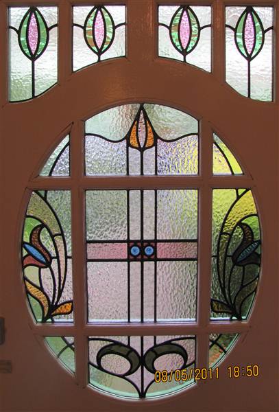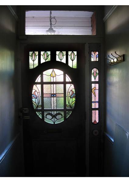 | This spectacular door was made by a carpenter to match the street style. The stained glass was made to match one of the original street designs of which there appeared a few different versions. Ref: an12a | ||