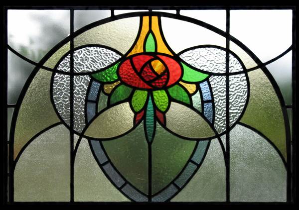 | This is an original panel from the Edwardian era that came in for repair. The Mackintosh style rose was a very popular feature that was adapted and long outlived the original design. Ref: ed18 | ||