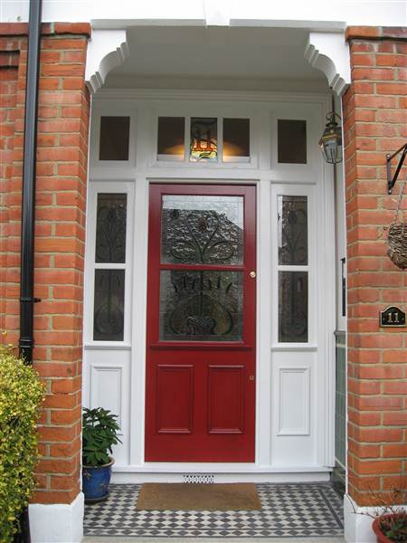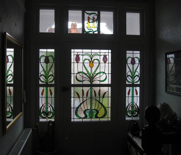 | The pattern for this lovely door set is derived from the area styles with special reference to the original tiles in the porch and to reflect the customers interests. Ref: ed21a | ||