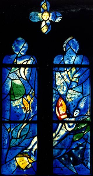 | This window is one of 12 designed by Marc Chagall (and made by Charles Marq of Reims) at All Saints Tudely in Kent. The first panel, a memorial tribute to Sarah d'Avigdor-Goldsmid was completed in 1967, thereafter the remaining panels were completed over 15 years. If you love stained glass you must visit this church, the effect of the blue and yellow hues is breath taking. You can find out more here. Ref: g7 | ||