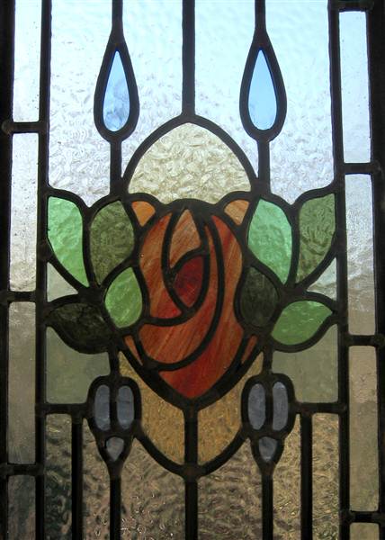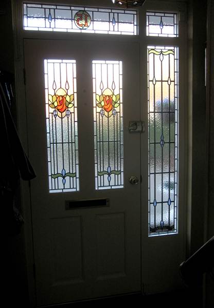 | This subtle doorset was based on the original panels shown here mc08. Some unusual textured glasses were used to bring out the features. The detail below shows the streaky colouring used in the rose. Laminate on the inside preserves the texture and charm of lead and glass on the outside. Ref: mc11a | ||