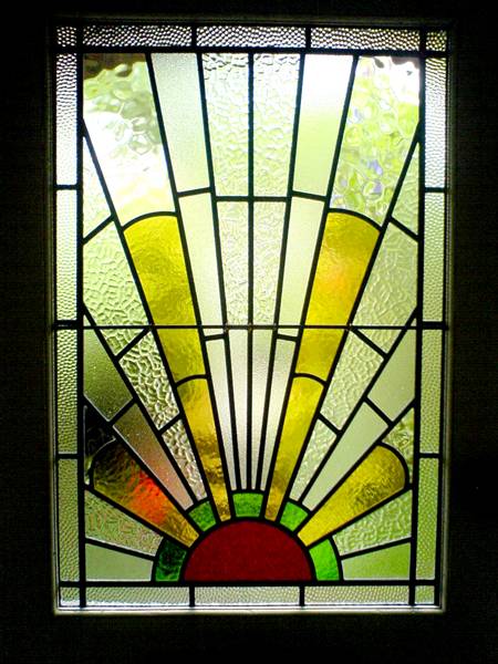 | This original panel was rescued from a house along the same street and stored in a garden for many years. The panel was completely stripped and rebuilt with new lead, broken old glasses was matched and replaced. The panel was then recemented and installed, good as new! Ref: re63 | ||
