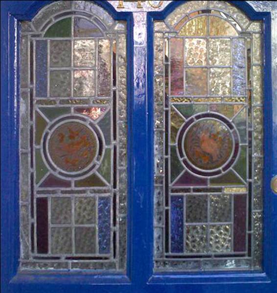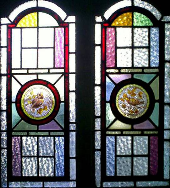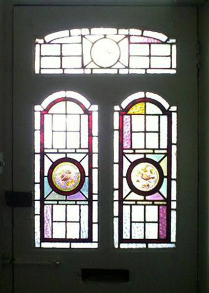 | This lovely original door set is typical of the street and surround. When these houses were built a factory style stained glass operation would have ensured that although designs were similar individual painted centres were different and gave uniqueness to the properties. In this door set the left had panel (inside view) was removed and rebuilt, replacing any cracked pieces. Ref: re65a | ||