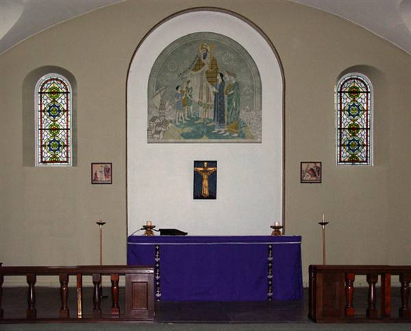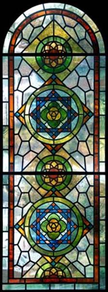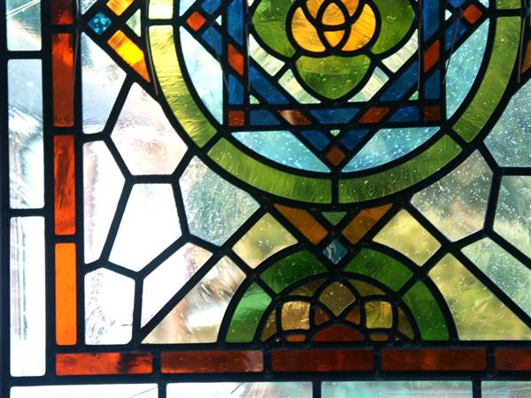 | St Nicholas Church, Kidbrooke. The brief for this new work was something traditional, not figurative and that would blend well and not overpower the lovely mural by Hugh Powell painted in autumnal colours. The idea of the repeating geometric glazing pattern, used in medieval Churches and Cathedrals, was adapted to show one of the symbols of St Nicholas, the 3 gold coins. The glass used was all handmade and came from Poland, Germany, England and France. The English glass you can see in between the blue square borders and the olive green petal motif (rel05c). This glass is pale green Venetian and was made specially for the panels at St Nicholas Church by The Antique English Glass Company. As a practical means of protection the metal grills were reinstalled in front of the panels but sprayed pale grey to make the grill effect less obvious. If you would like to visit this church please contact the Rev. Tim Linkens at http://www.stnicholaskidbrooke.org. Ref: rel05a | ||