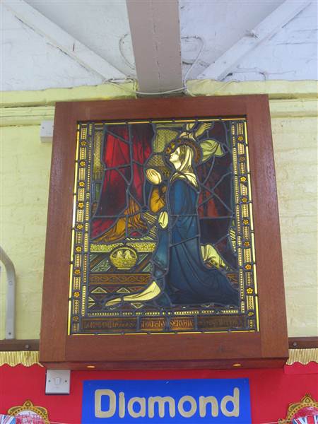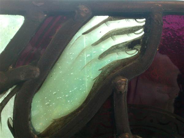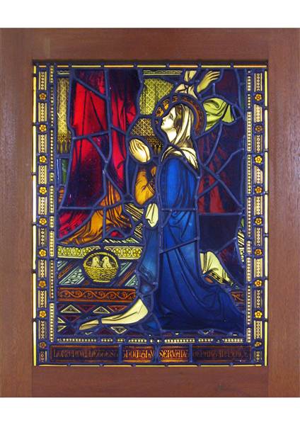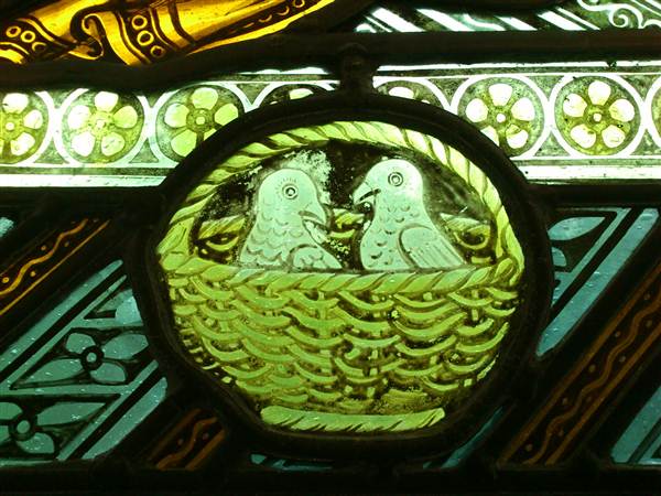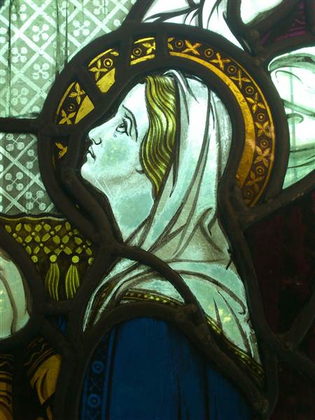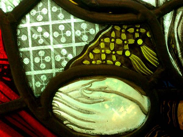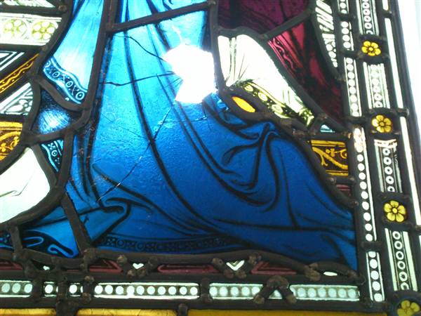 | This panel is a section of a larger Victorian panel saved from St Margarets Church Plumstead before it was demolished. You can see some fantastic photos of the old church here. The panel is now in St Margaret's CE Primary School where it is framed and backlit in a lightbox. Like many church panels the panel has been made with beautiful handmade glasses in strong colours and the seeds, bubbles and gentle irregularities all add to the liveliness of the glass. The panel came in for repair as one section of the blue robe was badly cracked. Fortunately this was replaced without any dismantling and a good colour match obtained. Below are close ups of the the original painted glass showing a variety of painted motifs and elegant detail. The text at the base of the panel reads "Lord now lettest thou thy servant depart in peace" and comes from the Song of Simeon. The new piece was painted by Flora Jamieson. Ref: rel08a | ||