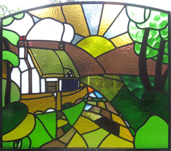 | This lovely detailed panel which came in for repair is made with some unusual glasses. Although it has a thirties look the glasses used were popular in the 50's and 60's and it is possible it was made then but with a skillful retro look. Ref: tf16 | ||
