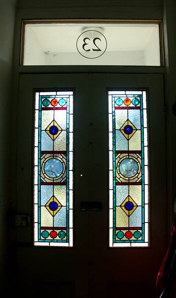 | This lively door set is in a classic Victorian style but shows how well more modern colour choices can work. The fanlight above the door shows the number painted white in a circle on laminate glass. A neat Victorian trick for maximising the light where a porch overhang exists. The central painted areas can be seen in close up on pw17 and pw18. Ref: vg26 | ||