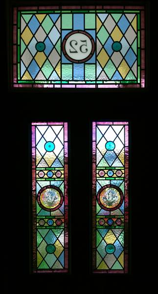 | An old style of panel with a cheerful choice of colours. The fanlight number is painted black on white flashed glass. For close up detail of the hand painted centres see pw19. Ref: vg27 | ||
