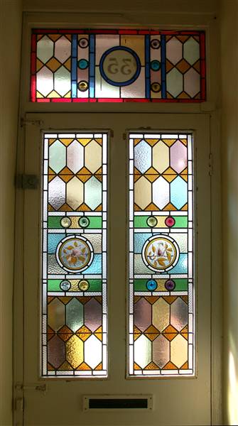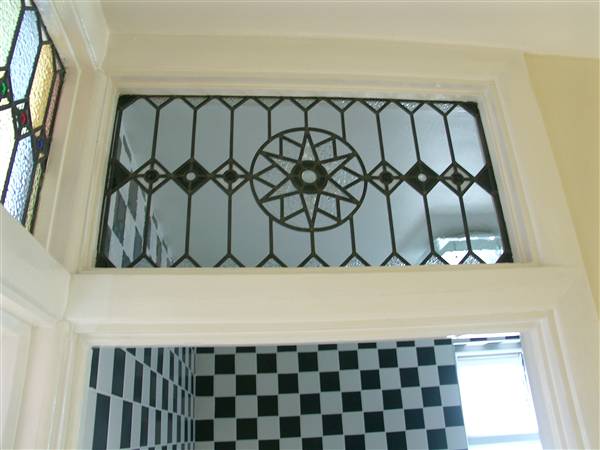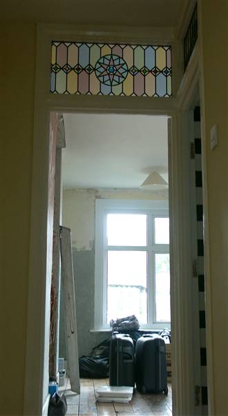 | These 2 fanlights were designed with the traditional style front door panels in mind, one in black and white is for a bathroom themed in the same colours and the coloured option is a softer look in the same design for the bedroom. The front door panels were repaired and cleaned. Ref: vg42a | ||