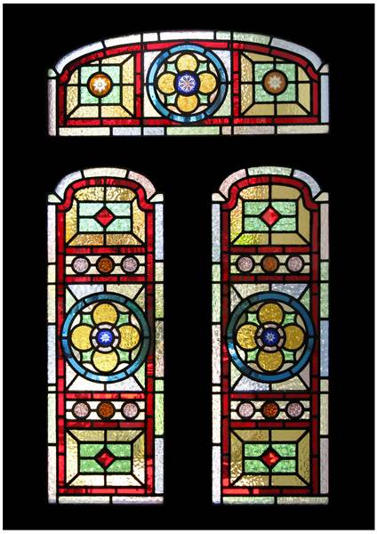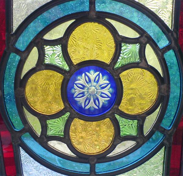 | This lovely set of bejeweled panels is a classic design I have made many times. Every time it's made with new customer choices of glass and every time it just looks great. The close up below shows the bespoke brilliant cut roundel in the horizontal panel. Ref: vg46 | ||